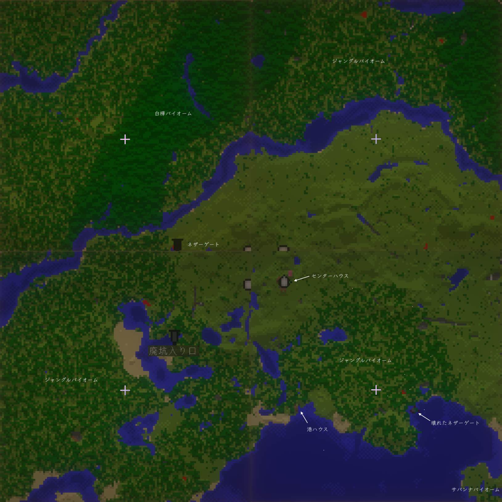 正月二日間の進捗をまとめてみました。まずは地図から。この地図は、2回拡大した地図を4枚繋ぎ合わせた、初期スポーン地点周辺の地図です。近くに村がないかと捜索したのですがこの範囲にはありませんでした。